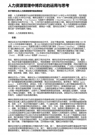 人力资源管理中博弈论的运用与思考关于博弈论在人力资源管理中的应用综述摘要:人力资源管理作为全新的管理理论和实践在西方始于20世纪60年代的美国,而在我国则是20世纪80年代才兴起。博弈论萌芽于20世纪初期,作为一门学科而确立的标志是美国数学家冯·诺伊曼(VonNeumann)与奥斯卡·摩根斯顿(OskarMorgenstern)在1944年所出版的《博弈论与经济行为》一书。70年代至今是博弈论的丰富壮大期。博弈论在所有研究领域都得到重大突破。博弈论开始对其它学科的研究产生强有力的影响。在人力资源...
