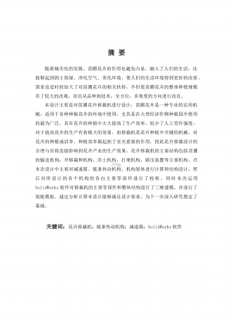 摘要随着城市化的发展,苗圃花卉的作用也越发凸显,融入了人们的生活,还能够起到固土保湿、净化空气、美化环境、使人们的生活环境得到更好的改善。国家也适时的加大了对苗圃花卉的相关扶持,不但使苗圃花卉的整体种植规模有了较大的改观,而且从品种到技术,全方位,多角度的方向进行改良。本设计主要是对苗圃花卉移栽机进行设计,苗圃花卉是一种专业的农用机械,适用于各种种植花卉的环境中使用,尤其是在大型经济作物种植园中使用的最为广泛,其在花卉的种植中大大提高了生产效率,较少了人工劳作强度,对于提高花卉的生产有着极大的效...