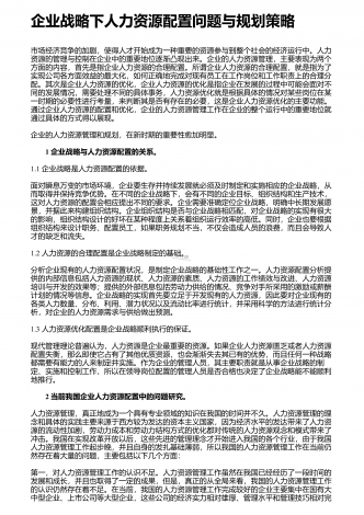 企业战略下人力资源配置问题与规划策略市场经济竞争的加剧,使得人才开始成为一种重要的资源参与到整个社会的经济运行中。人力资源的管理与控制在企业中的重要地位逐渐凸现出来。企业的人力资源管理,主要表现为两个方面的内容,首先是指企业人力资源的合理配置。所谓企业人力资源的合理配置,就是指为了实现公司各方面效益的最大化,如何正确地完成对现有员工在工作岗位和工作职责上的合理分配。其次是企业人力资源的优化,企业人力资源的优化是指企业在发展的过程中可能会面对不同的发展情况,需要处理不同的具体事务,人力资源优化就是...