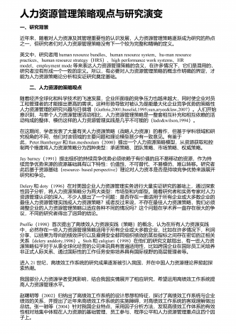 人力资源管理策略观点与研究演变一、研究背景近年来,随着对人力资源及其管理重要性的认识发展,人力资源管理策略逐渐成为研究的热点之一,但研究者们对人力资源管理策略没有下一个较为完整和精确的定义。英文中,研究者用humanresourcebundles、humanresourcesystem、hu-manresourcepractices、humanresourcestrategy(HRS)、highperformanceworksystems、HRmodel、employmentmode等来表达人力...