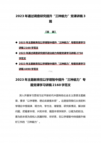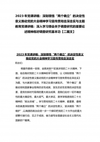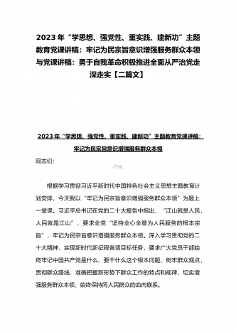 2023年主题教育党课讲稿:深入学习领会关于调查研究的重要论述精神练好调查研究基本功与“学思想、强党性、重实践、建新功”主题教育党课讲稿:牢记为民宗旨意识增强服务群众本领【二篇文】