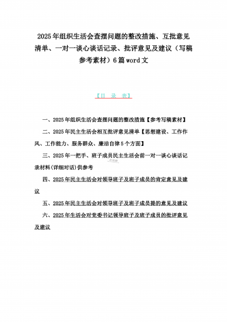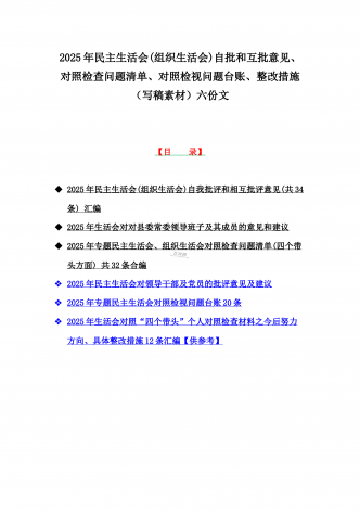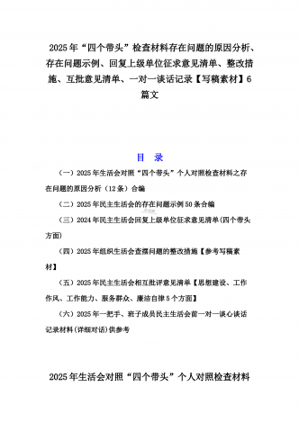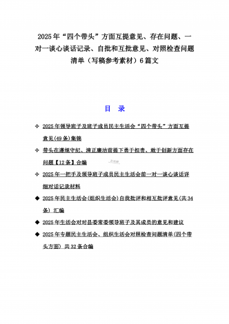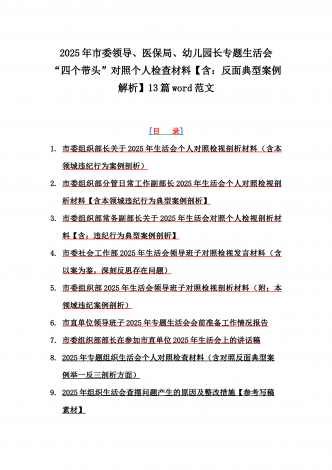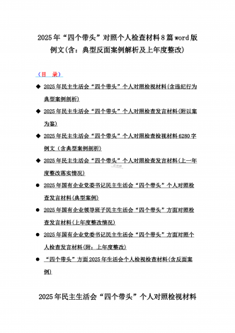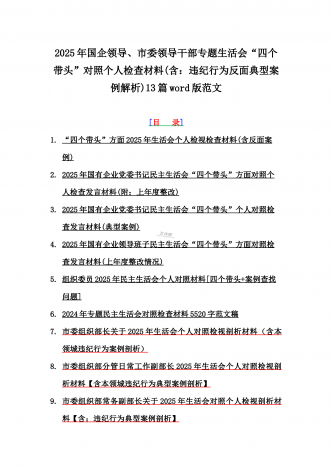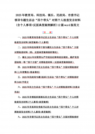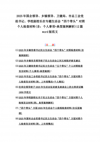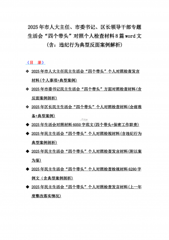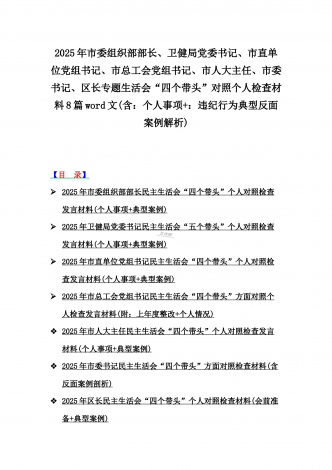 2025年市委组织部部长、卫健局党委书记、市直单位党组书记、市总工会党组书记、市人大主任、市委书记、区长专题生活会“四个带头”对照个人检查材料8篇word文(含:个人事项+:违纪行为典型反面案例解析)【目录】2025年市委组织部部长民主生活会“四个带头”个人对照检查发言材料(个人事项+典型案例)2025年卫健局党委书记民主生活会“五个带头”个人对照检查发言材料(个人事项+典型案例)2025年市直单位党组书记民主生活会“四个带头”个人对照检查发言材料(个人事项+典型案例)2025年市总工会...