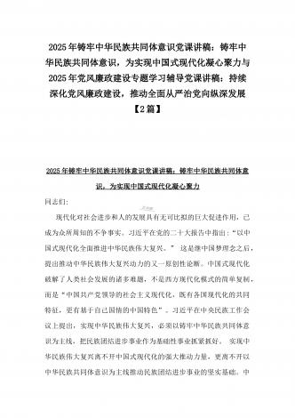 2025年铸牢中华民族共同体意识党课讲稿:铸牢中华民族共同体意识,为实现中国式现代化凝心聚力与2025年党风廉政建设专题学习辅导党课讲稿:持续深化党风廉政建设,推动全面从严治党向纵深发展【2篇】