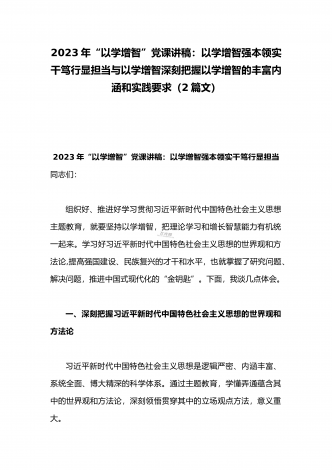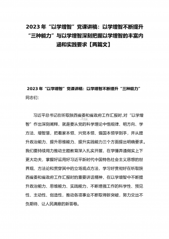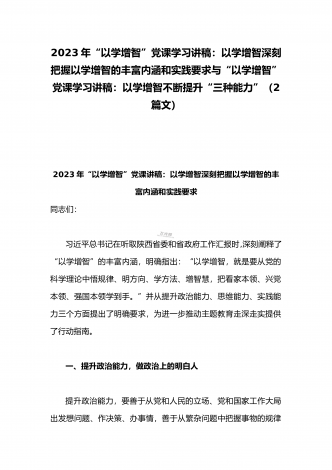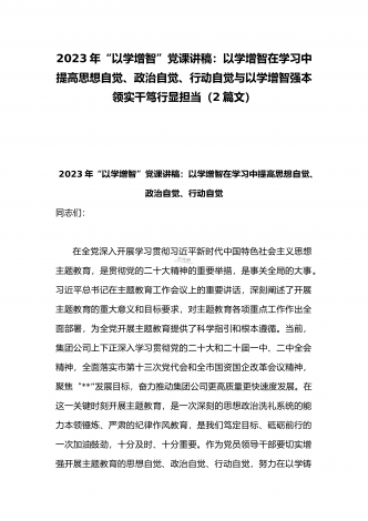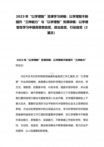 2023年“以学增智”党课学习讲稿:以学增智不断提升“三种能力”与“以学增智”党课讲稿:以学增智在学习中提高思想自觉、政治自觉、行动自觉(2篇文)