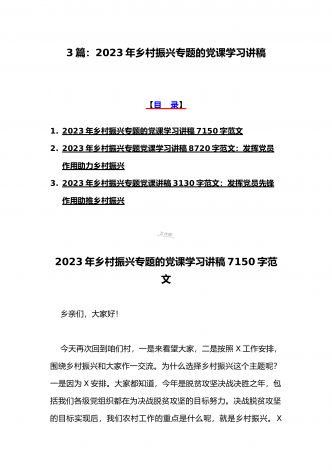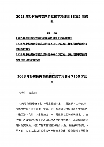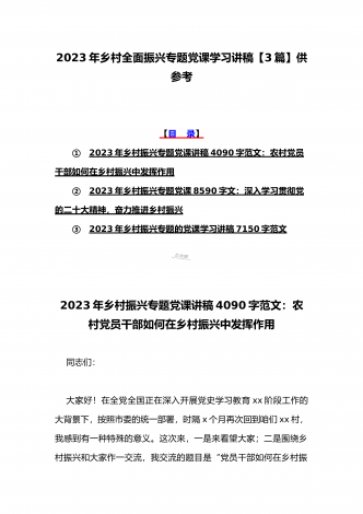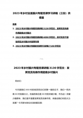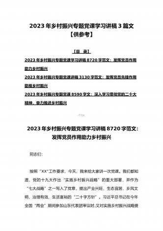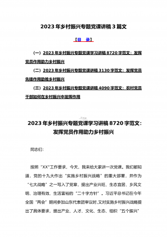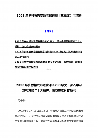 2023年乡村振兴专题党课学习讲稿【两篇文】:发挥党员作用助力乡村振兴与深入学习贯彻党的二十大精神,奋力推进乡村振兴2023年乡村振兴专题党课学习讲稿:发挥党员作用助力乡村振兴同志们:按照“XX”工作要求,今天,我来给大家讲一次党课。我们都知道,党的十九大作出“实施乡村振兴战略”的重大部署,并作为“七大战略”之一写入了党章,提出产业兴旺、生态宜居、乡风文明、治理有效、生活富裕的“二十字方针”。习近平总书记在今年全国“两会”期间参加山东代表团审议时,又对实施乡村振兴战略提出了具体要求,提出产业、人...