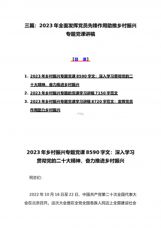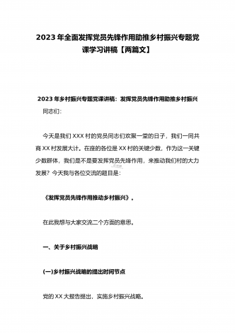 2023年乡村振兴专题党课学习讲稿【两篇文】:发挥党员作用助力乡村振兴与深入学习贯彻党的二十大精神,奋力推进乡村振兴