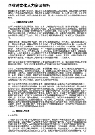 企业跨文化人力资源探析伴随着经济全球化的不断深化,国际商务活动和跨国经营活动迅速发展。国际商务环境中的沟通与合作不是简单的商务往来,而是不同文化间的交流与碰撞,是一种跨文化交际。企业管理者和员工的素质和能力事关企业的发展和成败,跨文化人力资源管理成为企业管理研究中的新焦点。 一、全球化与跨文化沟通全球化一般理解为全世界经济、政治、技术、文化整合的综合过程。随着科技的进步,信息技术和交通技术的飞速发展,空间距离大大缩短,人们的思维模式和行为方式都发生了显著的变化,地球村的每个公民都不同程度地被卷...
