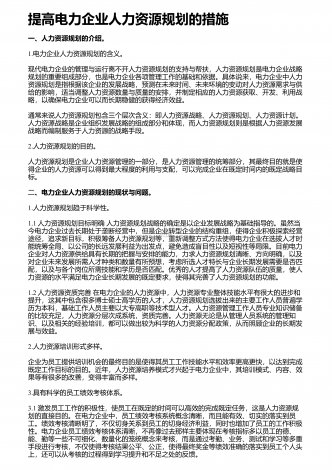 提高电力企业人力资源规划的措施一、人力资源规划的介绍。1.电力企业人力资源规划的含义。现代电力企业的管理与运行离不开人力资源规划的支持与帮扶,人力资源规划是电力企业战略规划的重要组成部分,也是电力企业各项管理工作的基础和依据。具体说来,电力企业中人力资源规划是指根据该企业的发展战略,预测在未来时间、未来环境的变动对人力资源需求与供给的影响,适当调整人力资源数量与质量的安排,并制定相应的人力资源获取、开发、利用战略,以确保电力企业可以而长期稳健的获得经济效益。通常来说人力资源规划包含三个层次含义:...