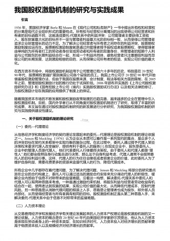 我国股权激励机制的研究与实践成果 引言1936年,美国经济学家Berle和Means在《现代公司和私有财产》一书中提出所有权和经营权的分离是现代企业组织形式的重要特点。所有权与经营权分离情况的出现使得公司经营者和所有者的目标函数不同,这就造成委托-代理关系中的利益冲突:公司管理者主要获得工资收入,股东财富最大化的目标并不一定与管理者利益最大化的目标相一致,从而使得公司管理者追求企业财富增长的动力不足。为了解决公司经营者与所有者之间存在的利益冲突,股票期权激励制度应运而生。股票期权激励制度就是通...