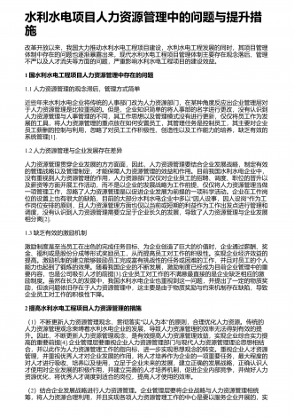 水利水电项目人力资源管理中的问题与提升措施改革开放以来,我国大力推动水利水电工程项目建设,水利水电工程发展的同时,其项目管理体制中存在的问题也逐渐暴露出来,现代水利水电工程项目管理体制主要存在观念落后、管理不严以及人才流失等方面的问题,严重影响水利水电工程项目的建设效益。1国水利水电工程项目人力资源管理中存在的问题1.1人力资源管理的观念滞后,管理方式简单近些年来水利水电企业将传统的人事部门改为人力资源部门,在某种角度反应出企业管理层对于人力资源管理是比较重视的。但是,企业知识简单的将人事部的名...