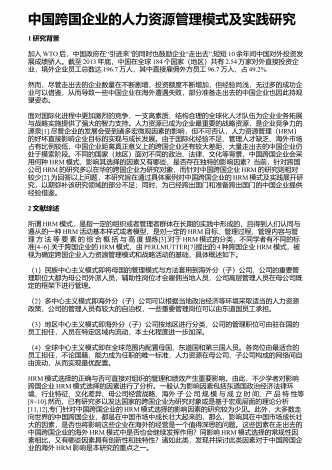 中国跨国企业的人力资源管理模式及实践研究1研究背景加入WTO“”“”后,中国政府在引进来的同时也鼓励企业走出去,短短10余年间中国对外投资发展成绩骄人。截至2013年底,中国在全球184个国家(地区)共有2.54万家对外直接投资企业,境外企业员工总数达196.7万人,其中直接雇佣外方员工96.7万人,占49.2%.然而,尽管走出去的企业数量在不断剧增,投资额度不断增加,但经验尚浅,无过多的成功企业可以借鉴,从而导致一些中国企业在海外遭遇失败,部分准备走出去的中国企业也因此持观望姿态。面对国际化进...