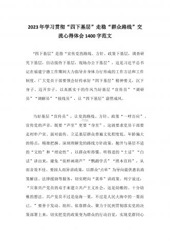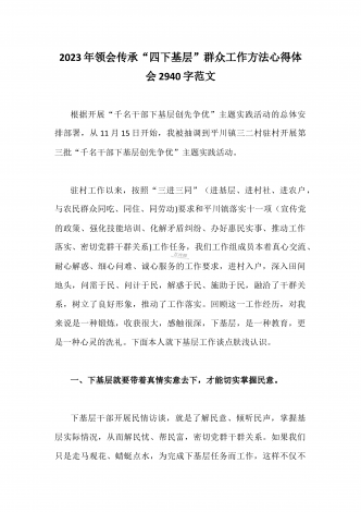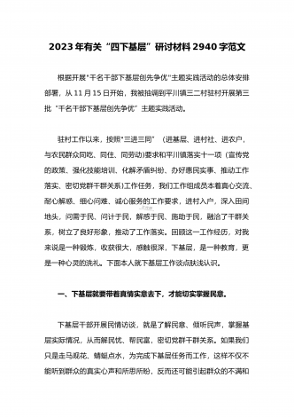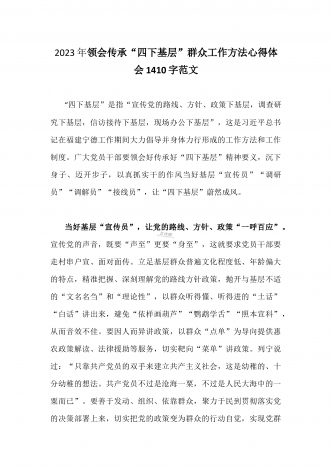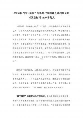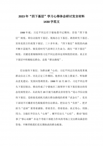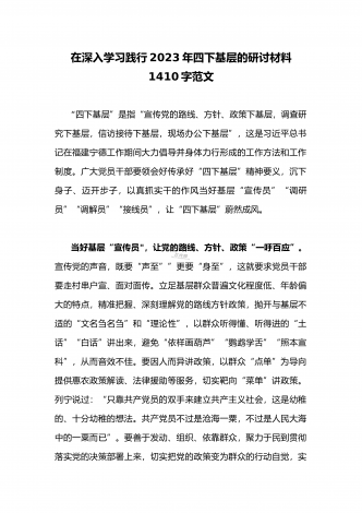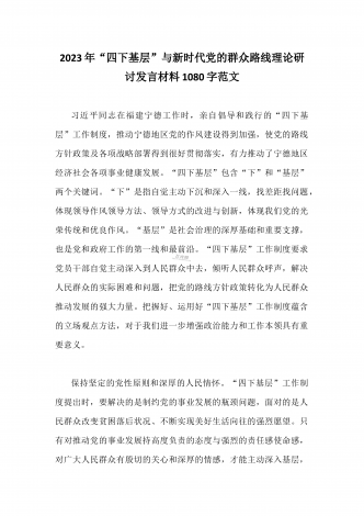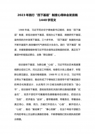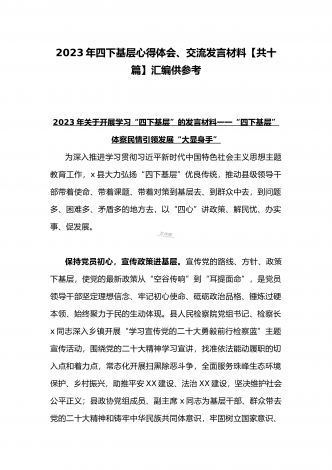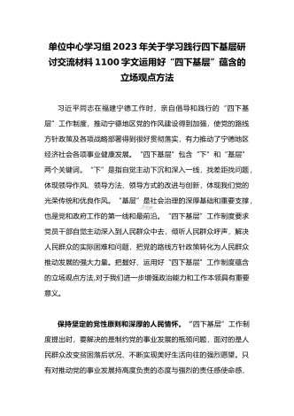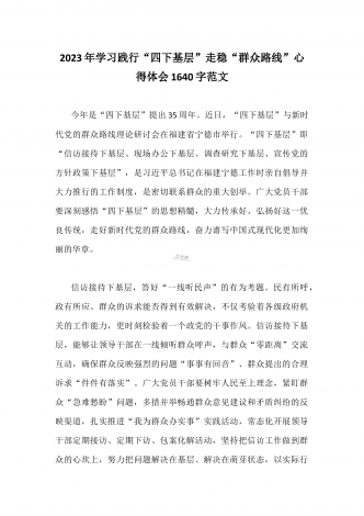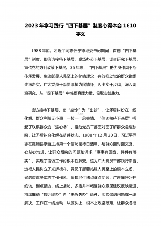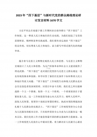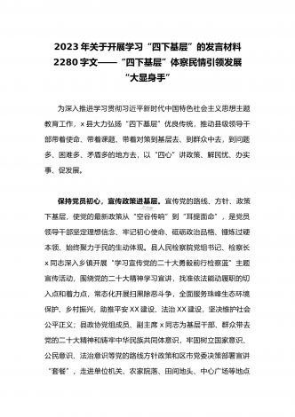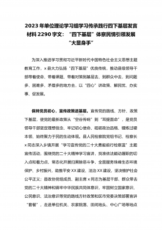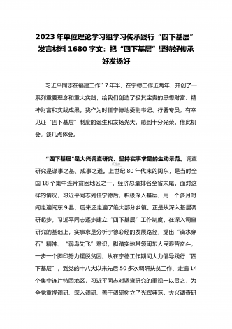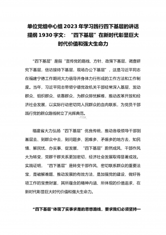 单位党组中心组2023年学习践行四下基层的讲话提纲1930字文:“四下基层”在新时代彰显巨大时代价值和强大生命力“四下基层”是指“宣传党的路线、方针、政策下基层,调查研究下基层,信访接待下基层,现场办公下基层”,这是习近平同志在福建宁德工作期间大力倡导并身体力行形成的工作方法和工作制度。当年,习近平同志带领宁德党政机关干部经常深入基层,发动群众、组织群众、依靠群众,为群众排忧解难,推动改革开放和经济社会发展,以实际行动密切同人民群众的血肉联系,为党员干部践行党的群众路线树立了光辉典范。福建省大力...