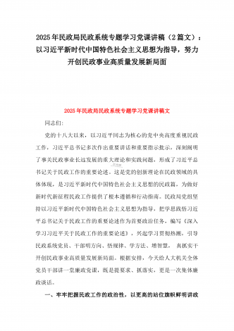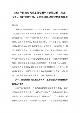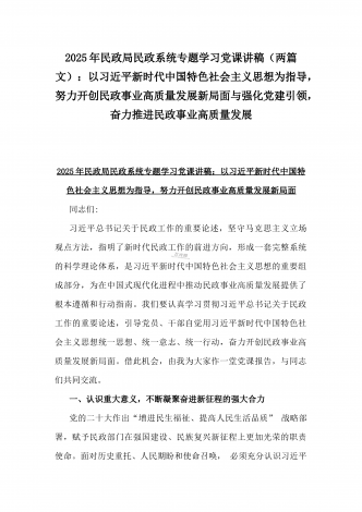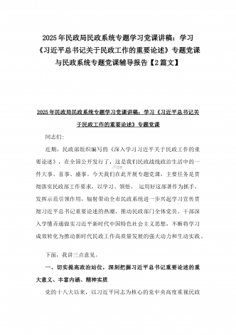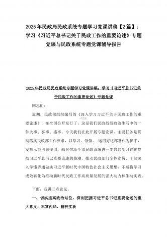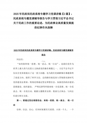 2025年民政局民政系统专题学习党课讲稿【2篇】:学习贯彻习近平总书记关于民政工作的重要论述,为民政事业高质量发展提供纪律作风保障与学习《习近平总书记关于民政工作的重要论述》专题党课