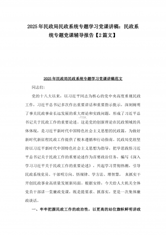 2025年民政局民政系统专题学习党课讲稿【2篇】:学习贯彻习近平总书记关于民政工作的重要论述,为民政事业高质量发展提供纪律作风保障与学习《习近平总书记关于民政工作的重要论述》专题党课2025年民政局民政系统专题学习党课讲稿:学习贯彻习近平总书记关于民政工作的重要论述,为民政事业高质量发展提供纪律作风保障同志们:2025年是“十四五”规划收官之年,是全面贯彻党的二十届三中全会精神进一步全面深化改革的关键一年,做好**民政工作意义重大。党的十八大以来,习近平总书记多次就民政工作发表重要讲话,作出一系...