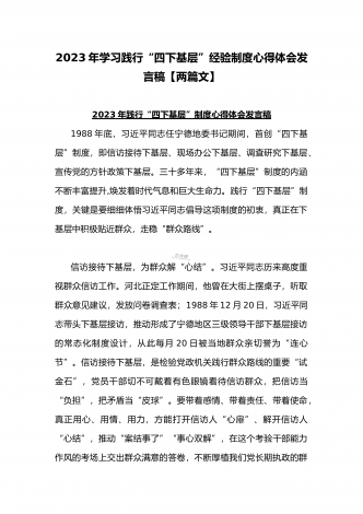 2023年“四下基层”与新时代党的群众路线理论研讨发言材料与学习贯彻“四下基层”走稳“群众路线”交流心得体会【两篇文】2023年“四下基层”与新时代党的群众路线理论研讨发言材料习近平同志在福建宁德工作期间亲自倡导推行“四下基层”工作制度。这一尊重人民主体地位的生动实践,为我们创造了宝贵的思想财富、精神财富和实践成果。我们要传承弘扬好“四下基层”优良传统,切实尊重人民主体地位,奋力谱写中国式现代化的绚丽华章。蕴含着马克思主义唯物史观的人民主体思想。马克思主义唯物史观创立了人民主体思想,为无产阶级革...