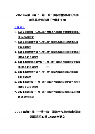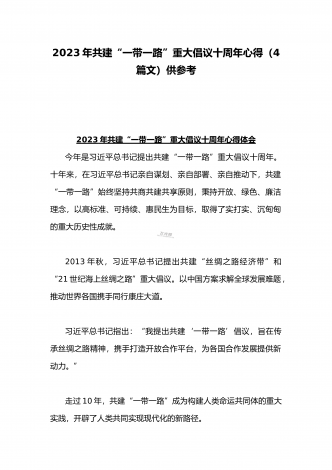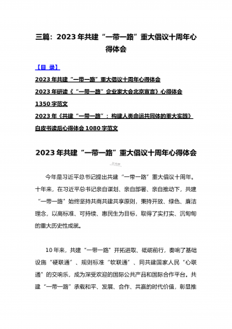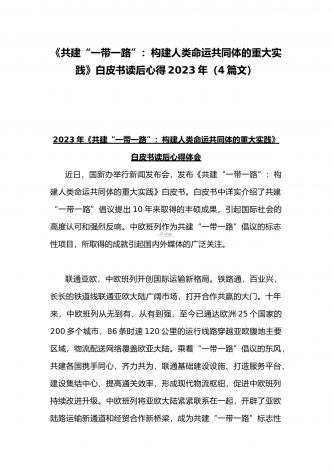 2023年学习《共建“一带一路”:构建人类命运共同体的重大实践》白皮书心得体会与收看第三届“一带一路”国际合作高峰论坛感悟心得(4篇文)2023年学习《共建“一带一路”:构建人类命运共同体的重大实践》白皮书心得体会今年是共建“一带一路”倡议提出十周年。近日,国务院新闻办发布《共建“一带一路”:构建人类命运共同体的重大实践》白皮书,全面介绍共建“一带一路”倡议提出十年来的丰硕成果,阐明中国推动共建“一带一路”高质量发展、同各国一道携手构建人类命运共同体的决心和行动。10年来,在各方的共同努力下,共...