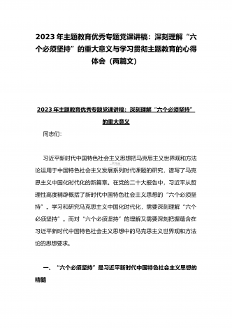 2023年主题教育专题党课讲稿:在“三真”下功夫、花精力将加强党的创新理论武装进行到底与主题教育读书班发言稿:坚持人民至上提升践行使命的能力【2篇文】2023年主题教育专题党课讲稿:在“三真”下功夫、花精力将加强党的创新理论武装进行到底同志们:习近平总书记在主持二十届中央政治局第六次集体学习时强调,党的二十大报告在总结历史经验基础上,提出并阐述了“两个结合”、“六个必须坚持”等推进理论创新的科学方法,为继续推进党的理论创新提供了根本遵循,我们要坚持好、运用好。习近平新时代中国特色社会主义思想不断...