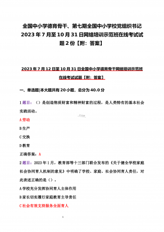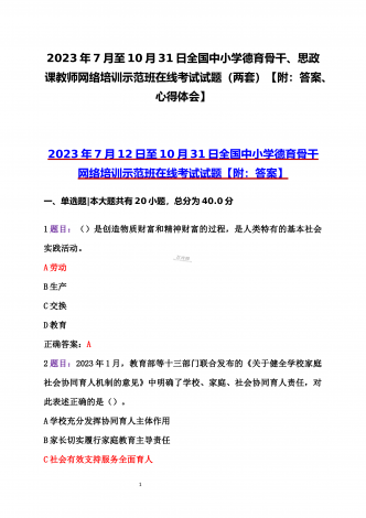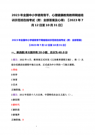 12023年全国中小学德育骨干、全国中小学班主任网络培训示范班在线考试2份试题(附:全部答案及教师培训心得)【2023年7月至10月31日】2023年全国中小学德育骨干网络培训示范班在线考试(附:全部答案)【2023年7月12日至10月31日】一、单选题|本大题共有20小题,总分为40.0分1题目:2022年4月,教育部正式印发《义务教育课程方案》,将()从综合实践活动课程中独立出来,正式成为中小学的一门独立课程。A劳动B科学C体育D艺术正确答案:A2题目:2012年党的十八大以来,中国特色社会...