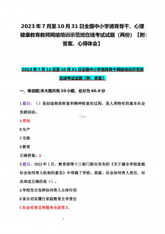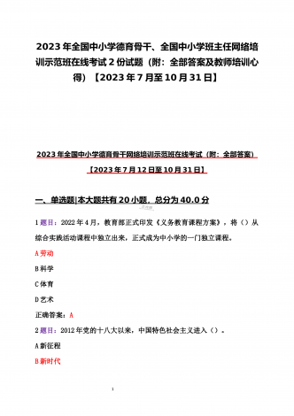 2023年全国中小学德育骨干、全国中小学班主任网络培训示范班在线考试2份试题(附:全部答案及教师培训心得)【2023年7月至10月31日】