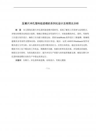压簧片冲孔落料级进模的系列化设计及有限元分析摘要本文围绕压簧片冲孔落料级进模开展研究。系统了解其工作原理与结构特点。详细分析模具结构设计流程,精确计算确定各零部件尺寸。对级进模的冲孔、落料、弯曲等工位进行初步设计,确保工位功能与精度达标。借助SolidWorks软件进行三维建模,精确构建模具各零部件及整体结构,直观展示其设计形态。随后,运用ANSYSWorkbench软件对模具进行力学分析,深入剖析冲压过程中模具的应力、应变分布状况。通过仿真冲压过程,模拟不同工况下模具的工作状态,预测潜在问题。...