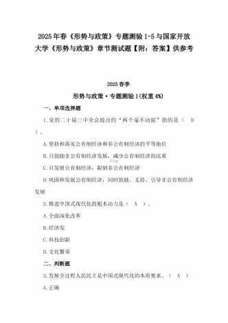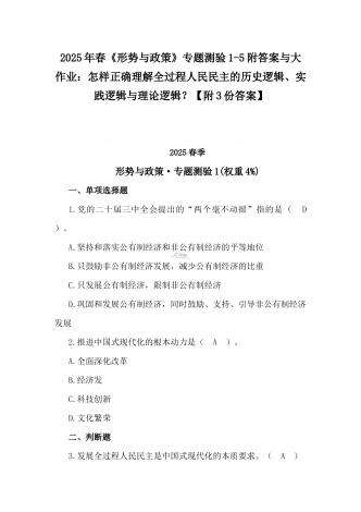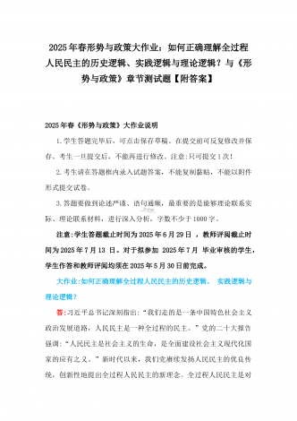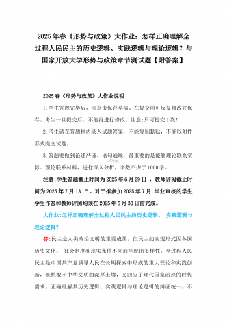 2025年春《形势与政策》大作业:怎样正确理解全过程人民民主的历史逻辑、实践逻辑与理论逻辑?与国家开放大学形势与政策章节测试题【附答案】