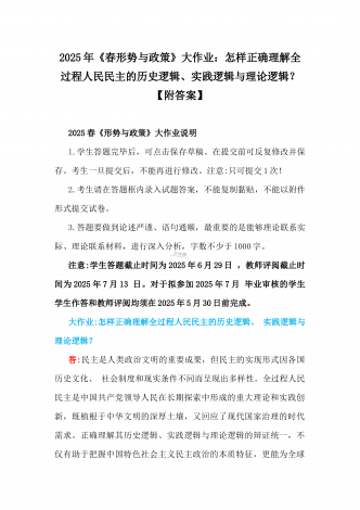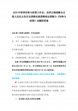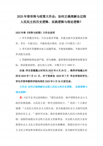 2025年春《形势与政策》大作业:怎样正确理解全过程人民民主的历史逻辑、实践逻辑与理论逻辑?与国家开放大学形势与政策章节测试题【附答案】2025春《形势与政策》大作业说明1.学生答题完毕后,可点击保存草稿。在提交前可反复修改并保存。考生一旦提交后,不能再进行修改。注意:只可提交1次!2.考生请在答题框内录入试题答案,不能复制黏贴,不能以附件形式提交试卷。3.答题要做到论述严谨、语句通顺,最重要的是能够理论联系实际、理论联系材料,进行深入分析,字数不少于1000字。注意:学生答题截止时间为2025...