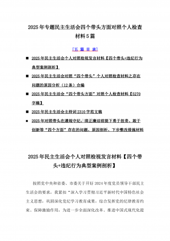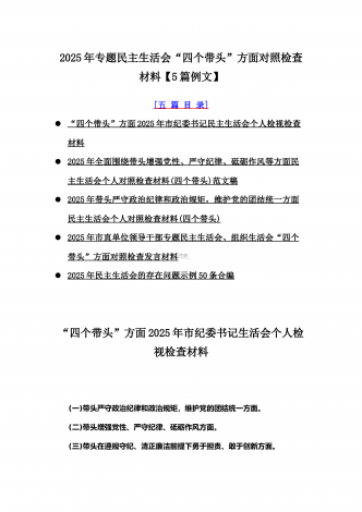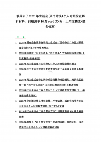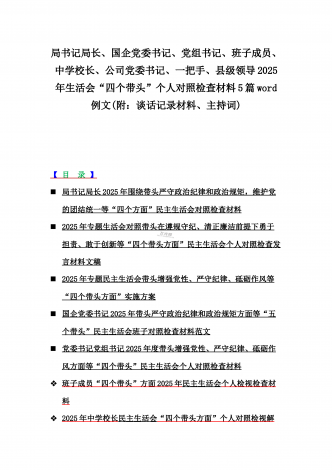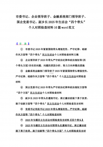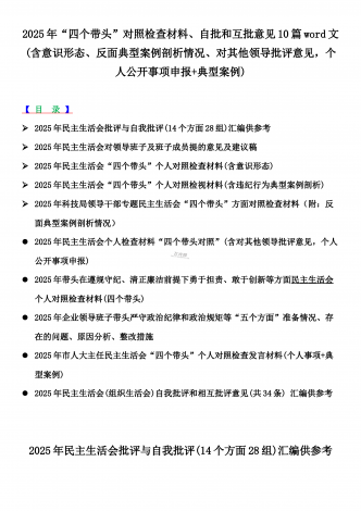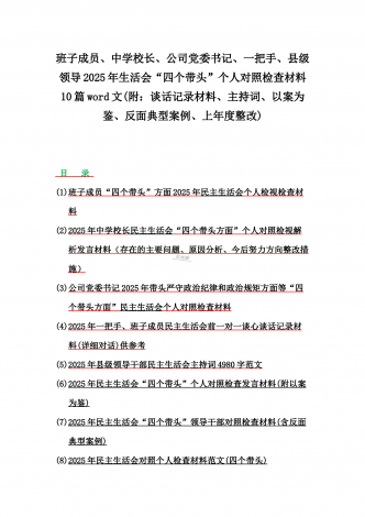 组织委员、医院院长、学校副校长、市总工会党组书记、乡党委副书记2025年“四个带头”个人对照检查材料10篇word文(附:反面案例、案例查找问题、典型案例解析、上年度整改+个人情况)【目录】2025年对照带头增强党性,严守纪律,砥砺作风等“四个带头方面”存在的突出问题、产生问题的原因分析及努力方向和改进措施2025年民主生活会对领导班子及班子成员的肯定意见及建议2024年对照检查报告材料整改建议与2024年对照检查报告材料(各8个方面)“四个带头”方面2025年民主生活会个人检视检查材料...