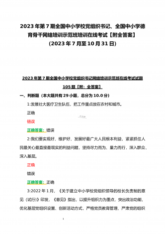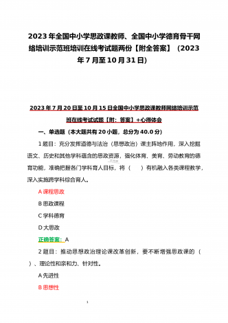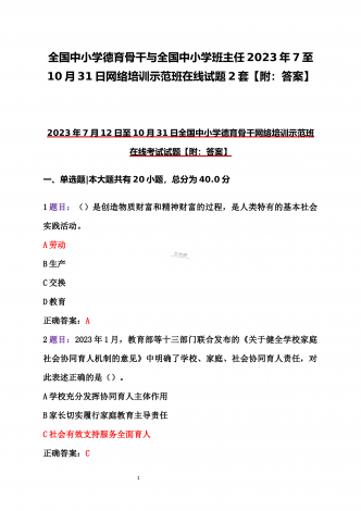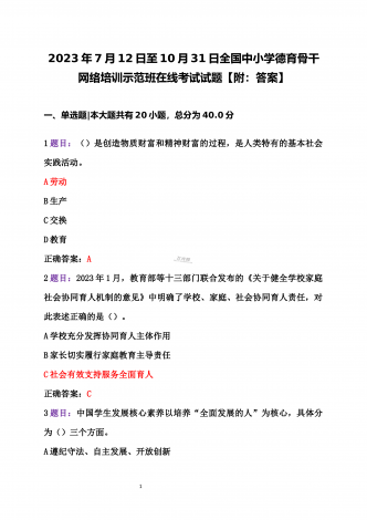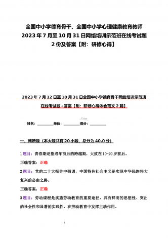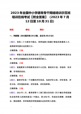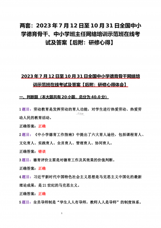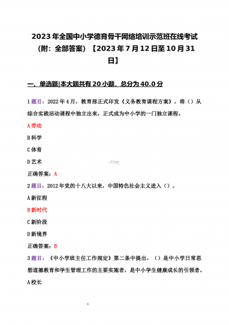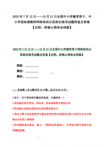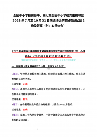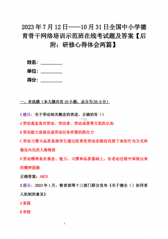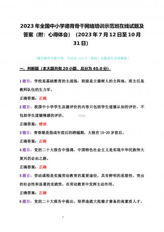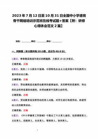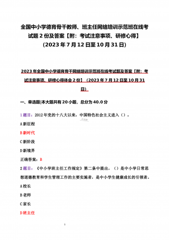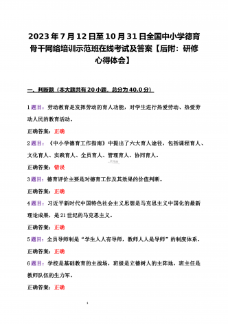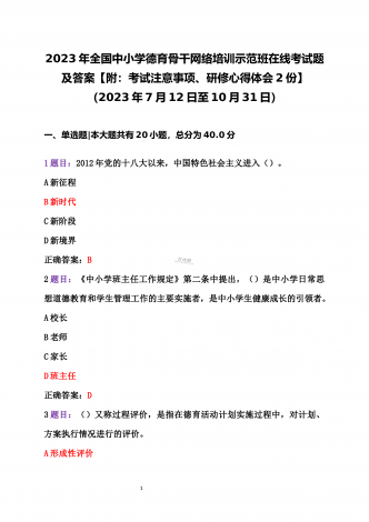 2023年全国中小学德育骨干网络培训示范班在线考试题及答案【附:考试注意事项、研修心得体会2份】(2023年7月12日至10月31日)