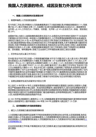 我国人力资源的特点、成因及智力外流对策 一、我国人力资源的特点及原因分析1、跳槽率偏高,人才流动的速度快在今年的二月份,英才网联对人们的跳槽意愿进行了大致的调查.英才网联的调查显示,71%有跳槽计划,19%表示不确定,仅有10%无跳槽计划;其中选择跳槽的原因,生活压力大(家庭费用支出升高)占50%,工作压力大(节奏快、任务重、无升职)占30%,社会压力大(亲戚、朋友相比较)20%.由图表可知,大部分人选择跳槽的原因是生活压力大,这是因为近些年来物价居高不下,生活成本不断增加,在无形中形成一种促...