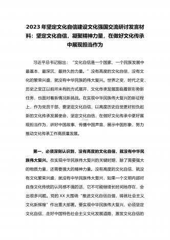2023年坚定文化自信建设文化强国专题研讨交流发言材料:以文化自信助推企业高质量发展党的二十大报告指出,“全面建设社会主义现代化国家,必须坚持中国特色社会主义文化发展道路,增强文化自信,围绕举旗帜、聚民心、育新人、兴文化、展形象建设社会主义文化强国,发展面向现代化、面向世界、面向未来的,民族的科学的大众的社会主义文化,激发全民族文化创新创造活力,增强实现中华民族伟大复兴的精神力量。”所谓“文化自信”,就是对自身文化价值的充分肯定和对自身文化发展的坚定信心。就X而言,就是要通过构建X高度的文化自信...