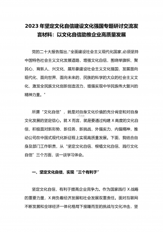 2023年坚定文化自信建设文化强国专题研讨交流发言材料:以文化自信助推企业高质量发展