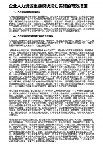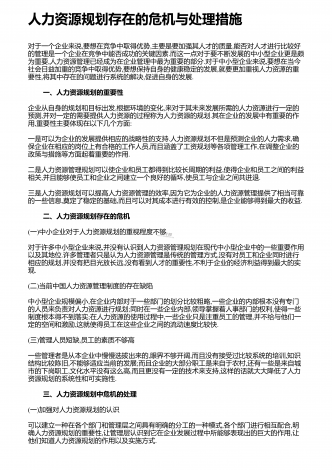 人力资源规划存在的危机与处理措施对于一个企业来说,要想在竞争中取得优势,主要是要加强其人才的质量,能否对人才进行比较好的管理是一个企业在竞争中能否成功的关键因素.而这一点对于要不断发展的中小型企业更是颇为重要,人力资源管理已经成为在企业管理中最为重要的部分.对于中小型企业来说,要想在当今社会日益加重的竞争中取得优势,要想保持自身的健康稳定的发展,就要更加重视人力资源的重要性,将其中存在的问题进行系统的解决,促进自身的发展. 一、人力资源规划的重要性企业从自身的规划和目标出发,根据环境的变化,来...