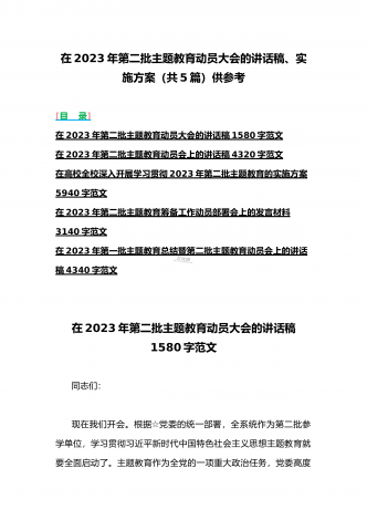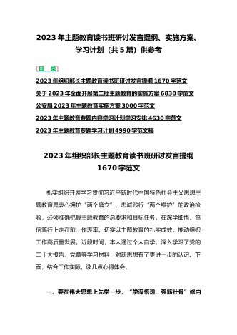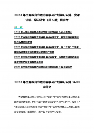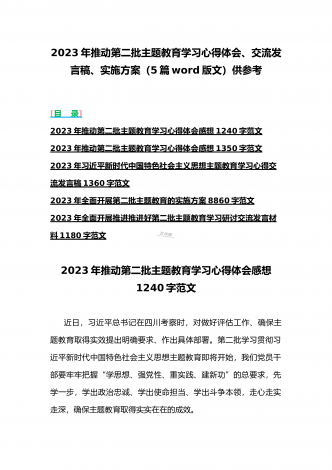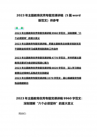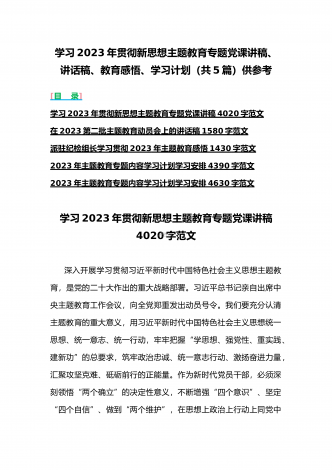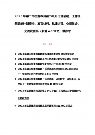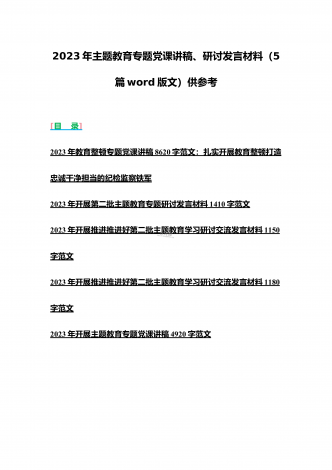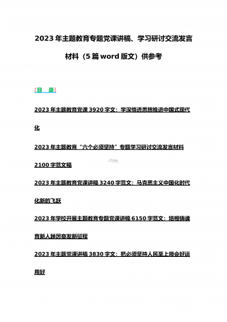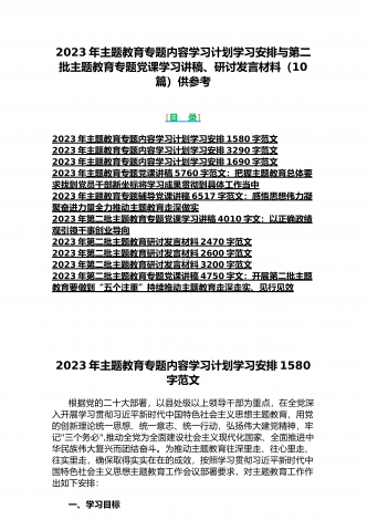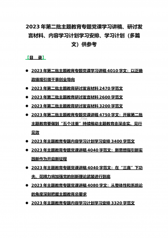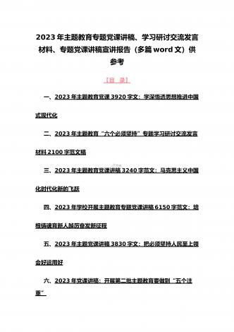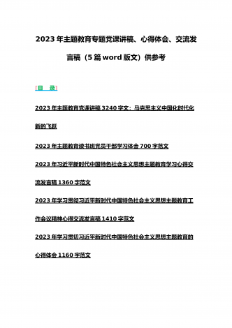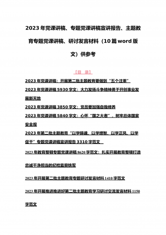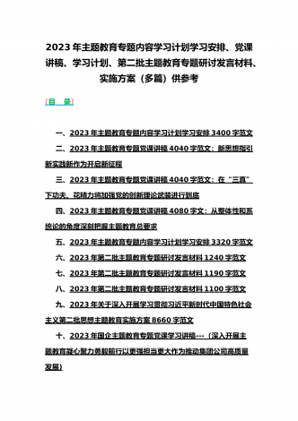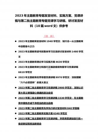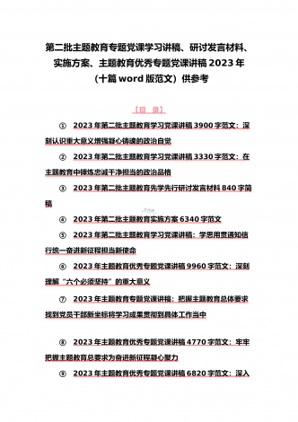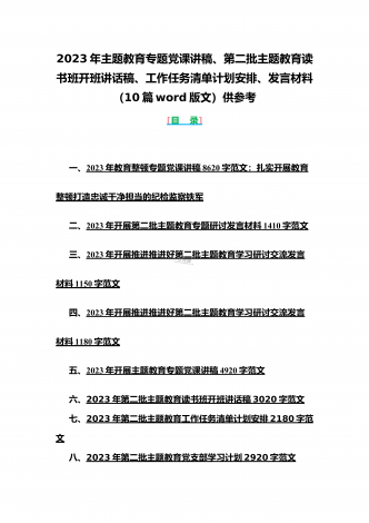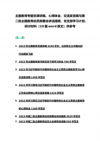 主题教育专题党课讲稿、心得体会、交流发言稿与第二批主题教育动员部署会讲话提纲、党支部学习计划、研讨材料(10篇word版文)供参考[目录]1.2023年主题教育党课讲稿3240字文:马克思主义中国化时代化新的飞跃2.2023年主题教育读书班党员干部学习体会700字范文3.2023年习近平新时代中国特色社会主义思想主题教育学习心得交流发言稿1360字范文4.2023年学习贯彻习近平新时代中国特色社会主义思想主题教育工作会议精神心得交流发言稿1410字范文5.2023年学习贯切习近平新时代中国特色社...