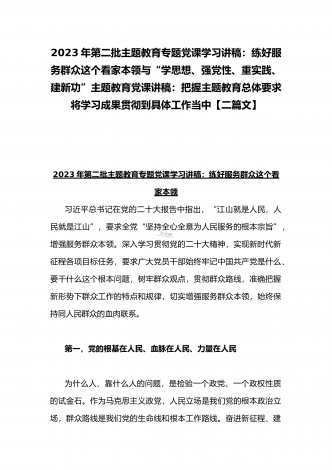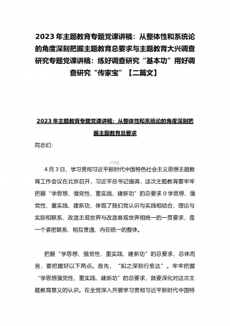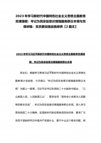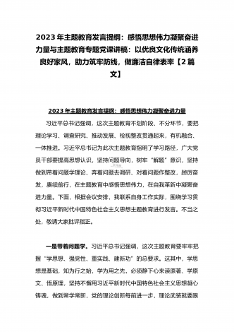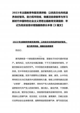 2023年主题教育专题党课讲稿:以优良文化传统涵养良好家风,助力筑牢防线,做廉洁自律表率与学习新时代中国特色社会主义思想主题教育党课提纲:牢记为民宗旨意识增强服务群众本领【2篇文】