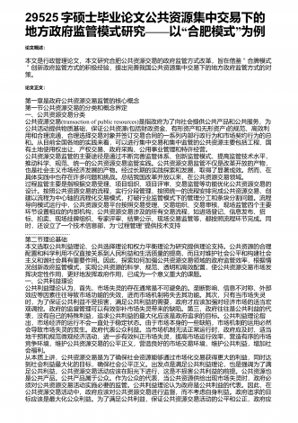 29525字硕士毕业论文公共资源集中交易下的——“”地方政府监管模式研究以合肥模式为例论文概述:本文是行政管理论文,本文研究合肥公共资源交易的政府监管方式改革,旨在借鉴"合脾模式"创新政府监管方式的积极经验,提出完善我国公共资源集中交易下的地方政府监管方式的对策。论文正文:第一章是政府公共资源交易监管的核心概念第一节公共资源交易的分类和概念界定一、公共资源交易分类公共资源交易(transactionofpublicresources)是指政府为了向社会提供公共产品和公共服务,为公共活动提供物质基...