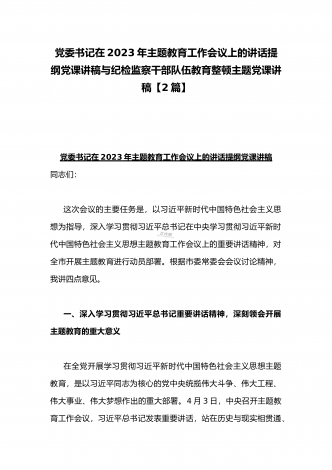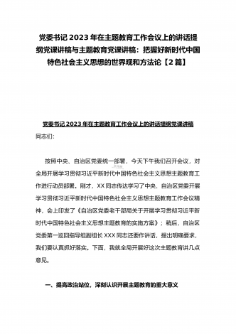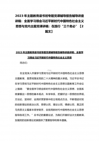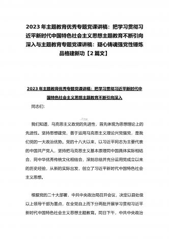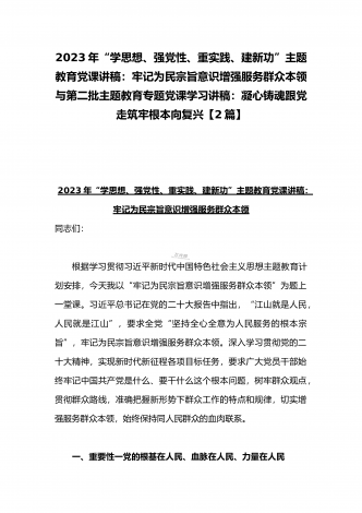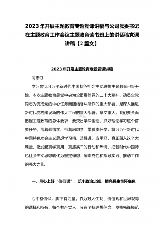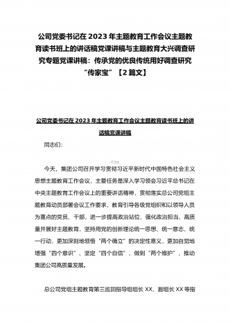 2023年主题教育大兴调查研究专题党课讲稿:用好党的传家宝大兴调查研究之风与主题教育优秀专题党课讲稿:把学习贯彻新时代中国特色社会主义思想主题教育不断引向深入【2篇文】2023年主题教育大兴调查研究专题党课讲稿:用好党的传家宝大兴调查研究之风同志们:日前,中共中央办公厅印发了《关于在全党大兴调查研究的工作方案》,并发出通知,要求各地区各部门结合实际认真贯彻落实。调查研究是我们党在各个历史时期做好工作的重要传家宝,是关系党和人民事业得失成败的大问题,特别是在全面贯彻落实党的二十大精神的开局之年,“...