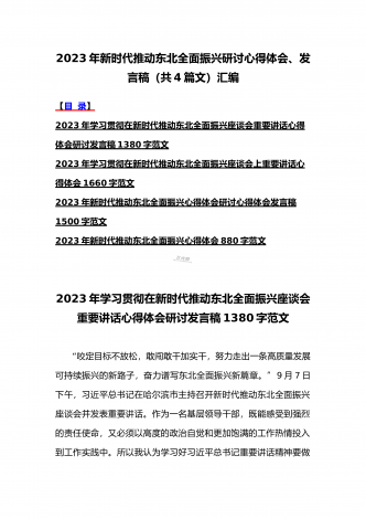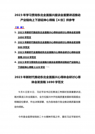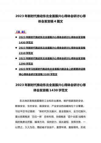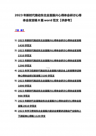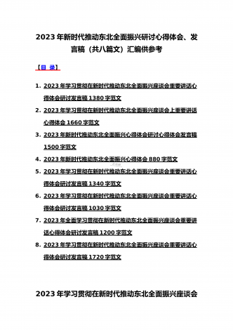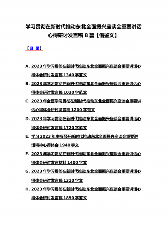贯彻学习2023年主持召开新时代推动东北全面振兴座谈会重要讲话精神心得体会、发言材料【共8篇word文】供参考【目录】1.学习2023年主持召开新时代推动东北全面振兴座谈会重要讲话精神心得体会1940字文2.2023年学习贯彻在新时代推动东北全面振兴座谈会重要讲话心得体会研讨发言材料1400字文3.2023年学习贯彻在新时代推动东北全面振兴座谈会重要讲话心得体会研讨发言稿1310字文4.2023年学习贯彻在新时代推动东北全面振兴座谈会重要讲话心得体会研讨发言稿1850字范文5.2023年新时代推...