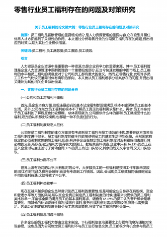 零售行业员工福利存在的问题及对策研究 关于员工福利的论文第六篇:零售行业员工福利存在的问题及对策研究 摘要:员工福利是薪酬管理的重要组成部分,是人力资源管理的重要内容,它在吸引并留住优秀人才方面起到了关键性的作用。本文通过分析零售行业的公司员工福利存在的问题,提出相应的对策,以期为其他企业提供借鉴。 关键词:员工福利;员工满意度;员工激励;员工绩效; 引言 人力资源是企业资源中最重要的一种资源,也是企业竞争力的重要来源。其中,员工福利管理是企业人力资源管理中薪酬管理的一个重要组成部分,...