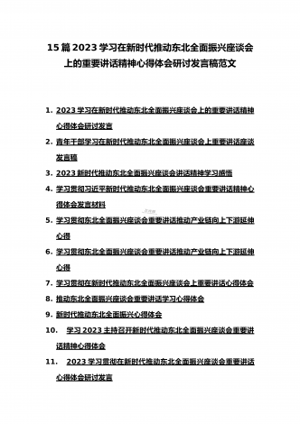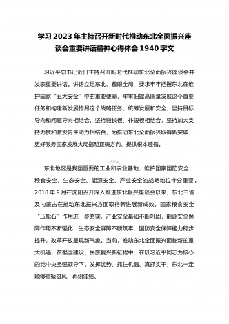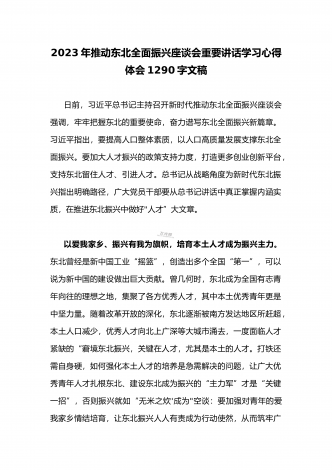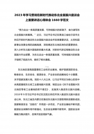 2023年学习贯彻新时代推动东北全面振兴座谈会重要讲话精神心得体会发言材料与青年干部学习在新时代推动东北全面振兴座谈会上重要讲话座谈发言稿【两篇】2023年学习贯彻习近平新时代推动东北全面振兴座谈会重要讲话精神心得体会发言材料9月7日下午,新时代推动东北全面振兴座谈会黑龙江省哈尔滨市召开,会议强调,新时代新征程推动东北全面振兴,要贯彻落实党的二十大关于推动东北全面振兴实现新突破的部署,完整准确全面贯彻新发展理念,牢牢把握东北在维护国家“五大安全”中的重要使命,牢牢把握高质量发展这个首要任务和构建...