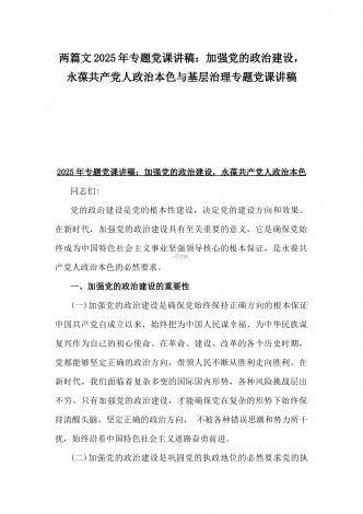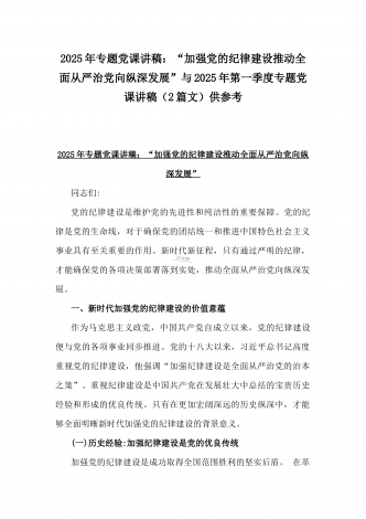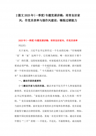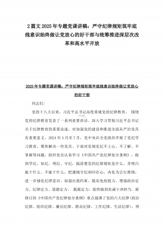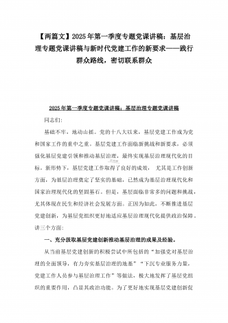 【两篇文】:2025年一季度专题党课讲稿:新时代党建工作的新要求——践行群众路线,密切联系群众与坚守底线,廉洁从政,以忠诚担当的干劲加强队伍党风廉政建设2025年一季度专题党课讲稿:新时代党建工作的新要求——践行群众路线,密切联系群众同志们:在新时代的征程中,中国共产党肩负着实现中华民族伟大复兴的历史使命。而践行群众路线,密切联系群众,始终是党的生命线和根本工作路线,也是新时代党建工作的新要求。一、群众路线的深刻内涵与历史意义(一)群众路线的内涵群众路线,即一切为了群众,一切依靠群众,从群众中来...