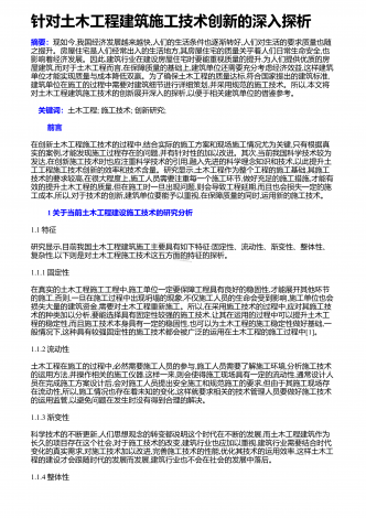 针对土木工程建筑施工技术创新的深入探析摘要:现如今,我国经济发展越来越快,人们的生活条件也逐渐转好,人们对生活的要求质量也随之提升。房屋住宅是人们经常出入的生活地方,其房屋住宅的质量关乎着人们日常生命安全,也影响着经济发展。因此,建筑行业在建设房屋住宅时要能重视质量的提升,为人们提供优质的房屋建筑,而对于土木工程而言,在保障质量的基础上,建筑单位还需要充分考虑经济效益,这样建筑单位才能实现质量与成本降低双赢。为了确保土木工程的质量达标,符合国家提出的建筑标准,建筑单位在施工的过程中需要对建筑细节...