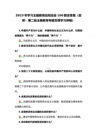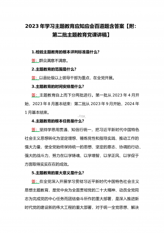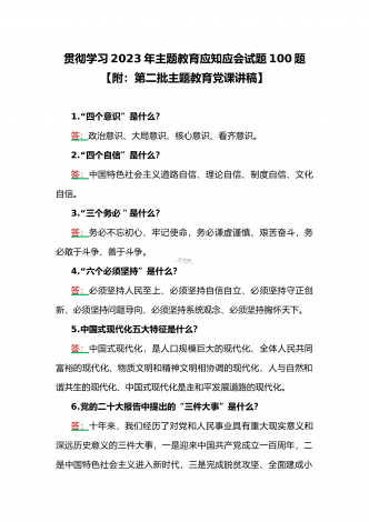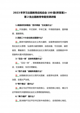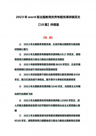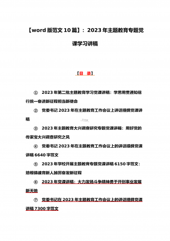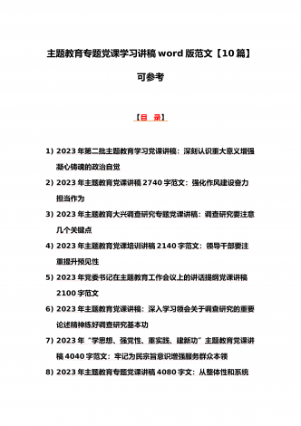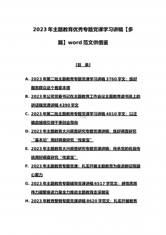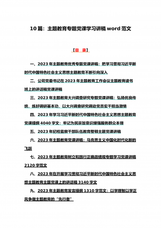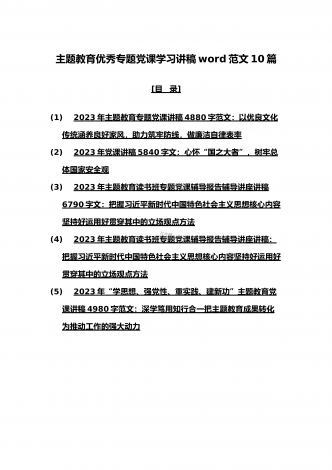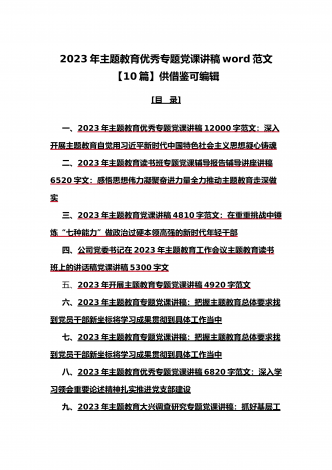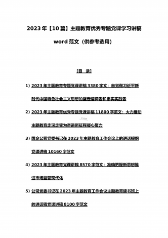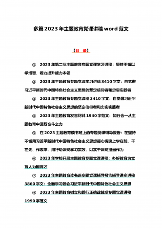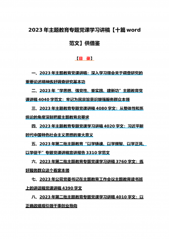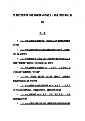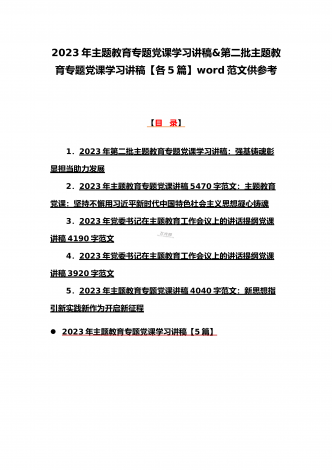 2023年主题教育专题党课学习讲稿&第二批主题教育专题党课学习讲稿【各5篇】word范文供参考【目录】1.2023年第二批主题教育专题党课学习讲稿:强基铸魂彰显担当助力发展2.2023年主题教育专题党课讲稿5470字范文:主题教育党课:坚持不懈用习近平新时代中国特色社会主义思想凝心铸魂3.2023年党委书记在主题教育工作会议上的讲话提纲党课讲稿4190字范文4.2023年党委书记在主题教育工作会议上的讲话提纲党课讲稿3920字范文5.2023年主题教育专题党课讲稿4040字范文:新思想指引新实践...