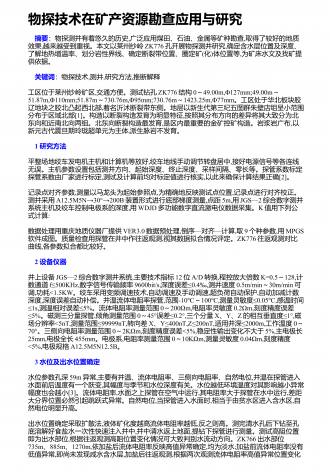 物探技术在矿产资源勘查应用与研究 摘要:物探测井有着悠久的历史,广泛应用煤田、石油、金属等矿种勘查,取得了较好的地质效果,越来越受到重视。本文以莱州纱岭ZK776孔开展物探测井研究,确定含水层位置及深度、了解地热增温率、划分岩性界线、确定断裂带位置、圈定矿(化)体位置等,为矿床水文及找矿提供依据。 关键词:物探技术,测井,研究方法,推断解释工区位于莱州纱岭矿区,交通方便。测试钻孔ZK776结构0~49.00m,Φ127mm;49.00m~51.87m,Φ110mm;51.87m~73...