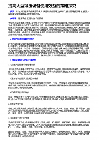 提高大型锻压设备使用效益的策略探究 摘要:针对大型锻压设备使用现状,以使用和效益管理为突破口,提出管理提升理念,提升大型锻压设备管理效益,降低费用消耗。 关键词:锻压设备,管理效益,节能降耗大型锻压设备使用与管理,是大型企业生产顺利进行的重要保障因素,尤其是大型锻压设备管理工作,更是保障生产经营工作的重中之重。随着我国机械制造业和科技进步的迅猛发展、不断进步,对大型锻压设备的技术要求也不断提升。然而,在大型锻压设备管理过程中,仍然有忽视管理、无序管理、淡化管理及浪费的现象发生,导致大...