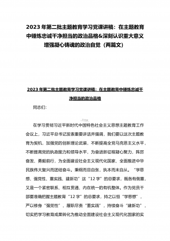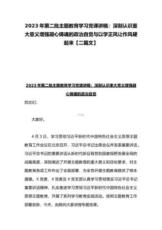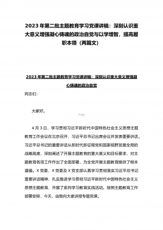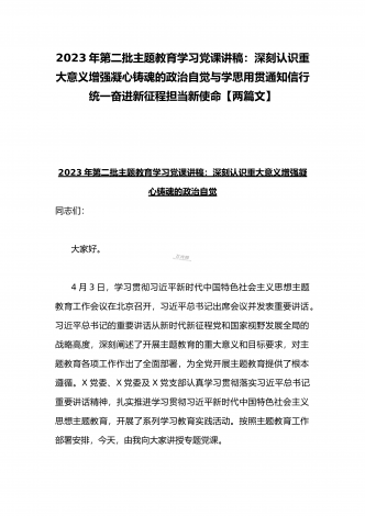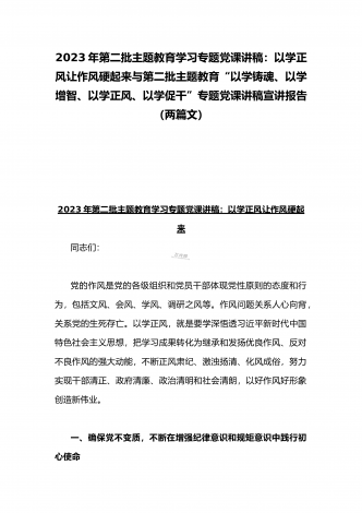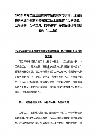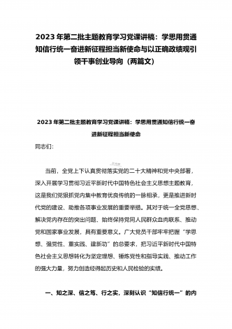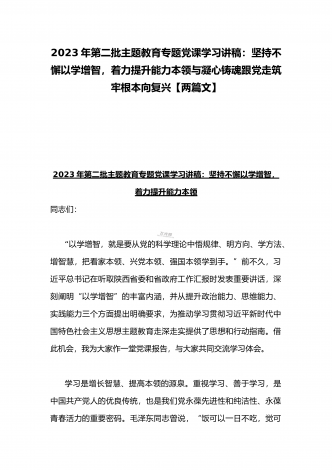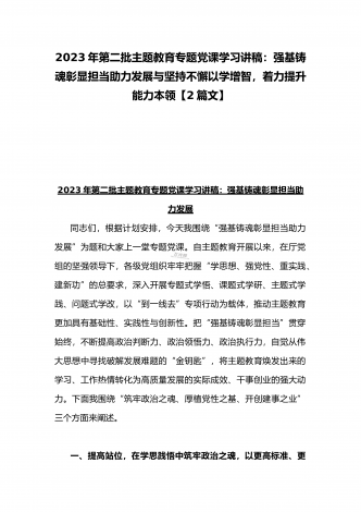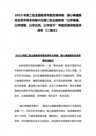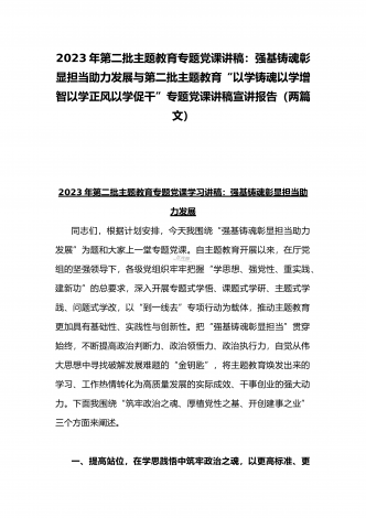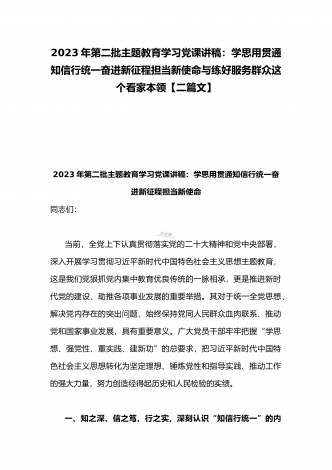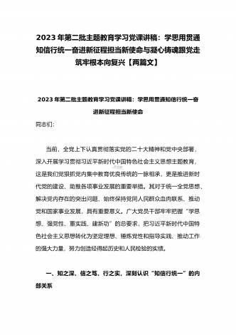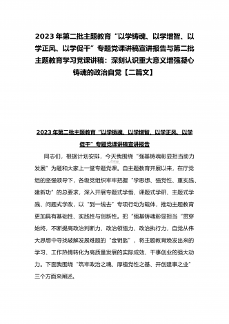 2023年第二批主题教育“以学铸魂、以学增智、以学正风、以学促干”专题党课讲稿宣讲报告与第二批主题教育学习党课讲稿:学思用贯通知信行统一奋进新征程担当新使命(两篇文)
