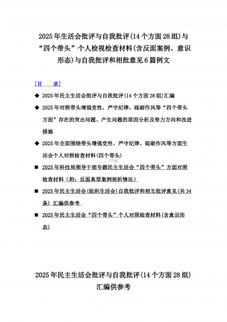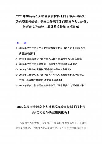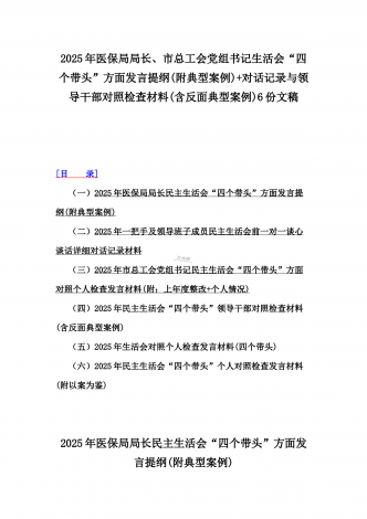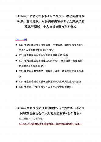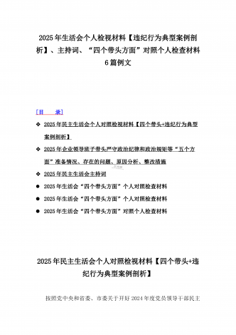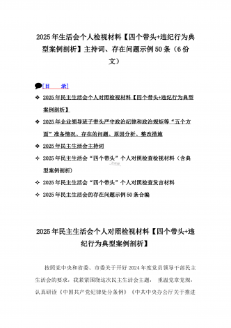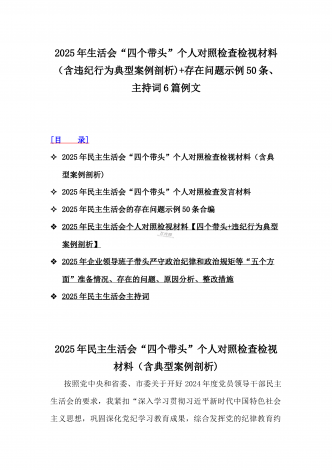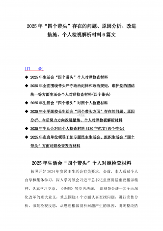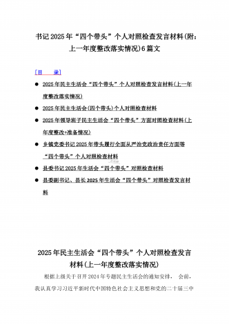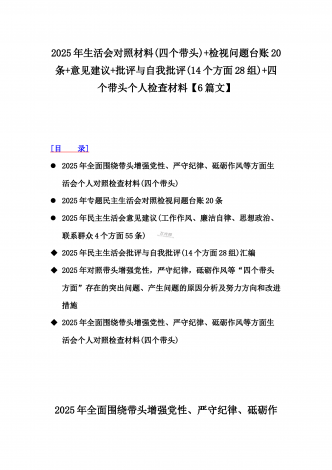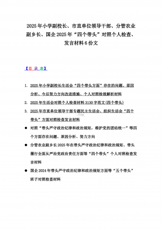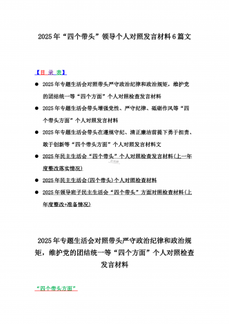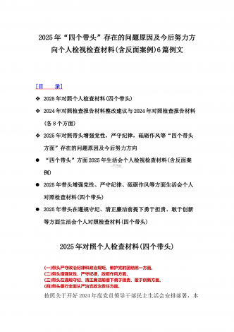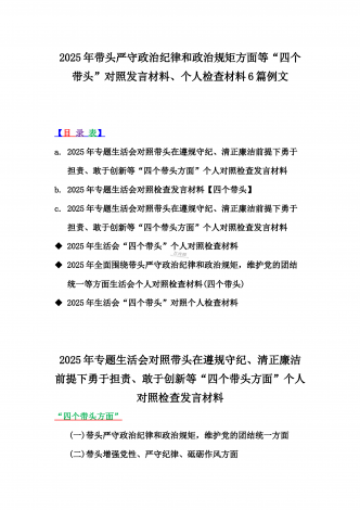 2025年国有企业党委书记“四个带头”对照个人检查发言材料(附:上年度整改)+方面互提意见49条与对照检视材料(含违纪行为典型案例剖析)6篇例文[目录]2025年国有企业党委书记民主生活会“四个带头”方面对照个人检查发言材料(附:上年度整改)2025年领导班子及班子成员民主生活会“四个带头”方面互提意见(49条)集锦2025年国企党委书记带头严守政治纪律和政治规矩等四个方面存在的主要问题、深层次原因分析、努力方向和整改措施个人对照检查发言材料(四个带头)2025年民主生活会“四个带头”个...