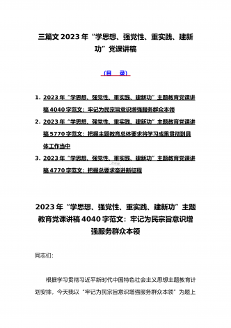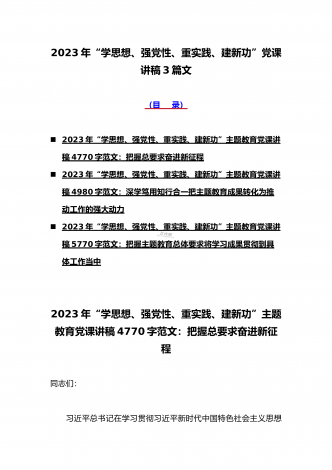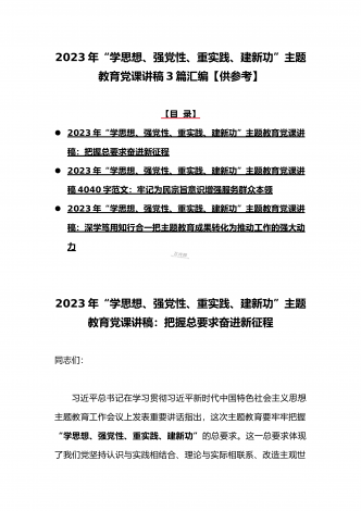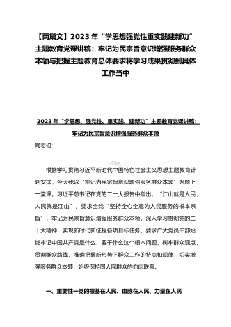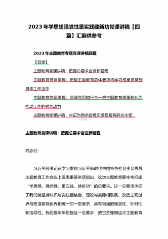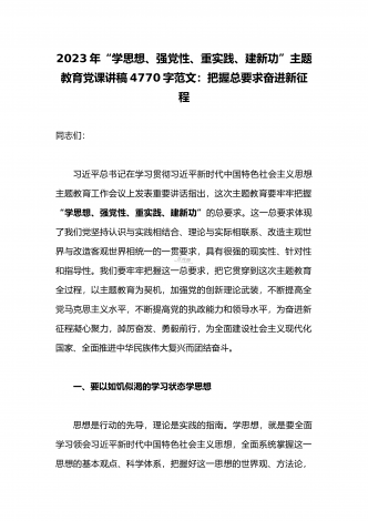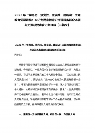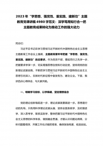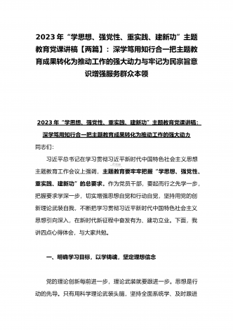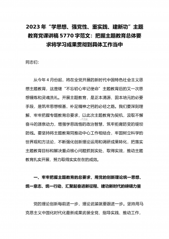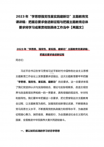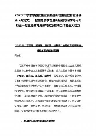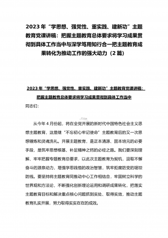 2023年“学思想、强党性、重实践、建新功”主题教育党课讲稿:把握主题教育总体要求将学习成果贯彻到具体工作当中与深学笃用知行合一把主题教育成果转化为推动工作的强大动力(2篇)