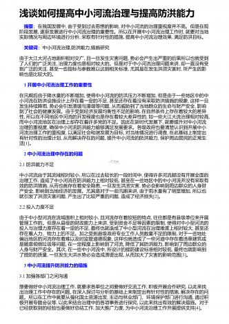 浅谈如何提高中小河流治理与提高防洪能力 摘要:在我国发展中,由于受到过去思想的影响,对中小河流的治理重视度并不高。但是在现阶段发展,逐渐发展进行中小河流治理的重要性。所以在开展中小河流治理工作时,就要对当地实际情况与周边环境进行分析,采取有针对性的措施,提高中小河流治理效果,满足防洪目标。 关键词:中小河流治理,防洪能力,措施研究由于大江大河占地面积相对交广,且一旦发生灾害问题,势必会产生出严重的后果所以也就受到了人们的广泛关注,治理力度也是相对较大的。但是对于中小河流治理问题来讲,...
