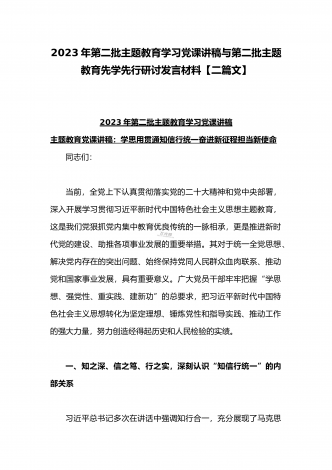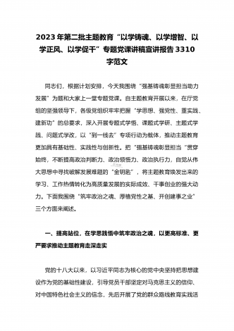 2023年第二批主题教育“以学铸魂、以学增智、以学正风、以学促干”专题党课讲稿宣讲报告3310字范文同志们,根据计划安排,今天我围绕“强基铸魂彰显担当助力发展”为题和大家上一堂专题党课。自主题教育开展以来,在厅党组的坚强领导下,各级党组织牢牢把握“学思想、强党性、重实践、建新功”的总要求,深入开展专题式学悟、课题式学研、主题式学践、问题式学改,以“到一线去”专项行动为载体,推动主题教育更加具有基础性、实践性与创新性。把“强基铸魂彰显担当“贯穿始终,不断提高政治判断力、政治领悟力、政治执行力,自觉...