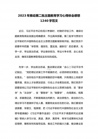 2023年推动第二批主题教育学习心得体会感想1240字范文近日,习近平总书记在四川考察时,对做好评估工作、确保主题教育取得实效提出明确要求、作出具体部署。第二批学习贯彻习近平新时代中国特色社会主义思想主题教育即将开始,我们党员干部要牢牢把握“学思想、强党性、重实践、建新功”的总要求,先学一步,学出政治忠诚、学出使命担当、学出斗争本领,走心走实走深,确保主题教育取得实实在在的成效。先学一步,学出政治忠诚,推动理论武装“走心二习近平总书记指出,“党的理论武装工作不能搞形式,必须持续往深里走、往实里走...